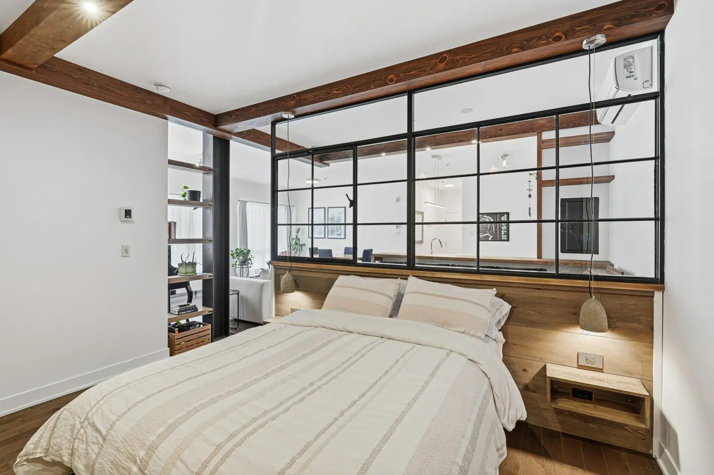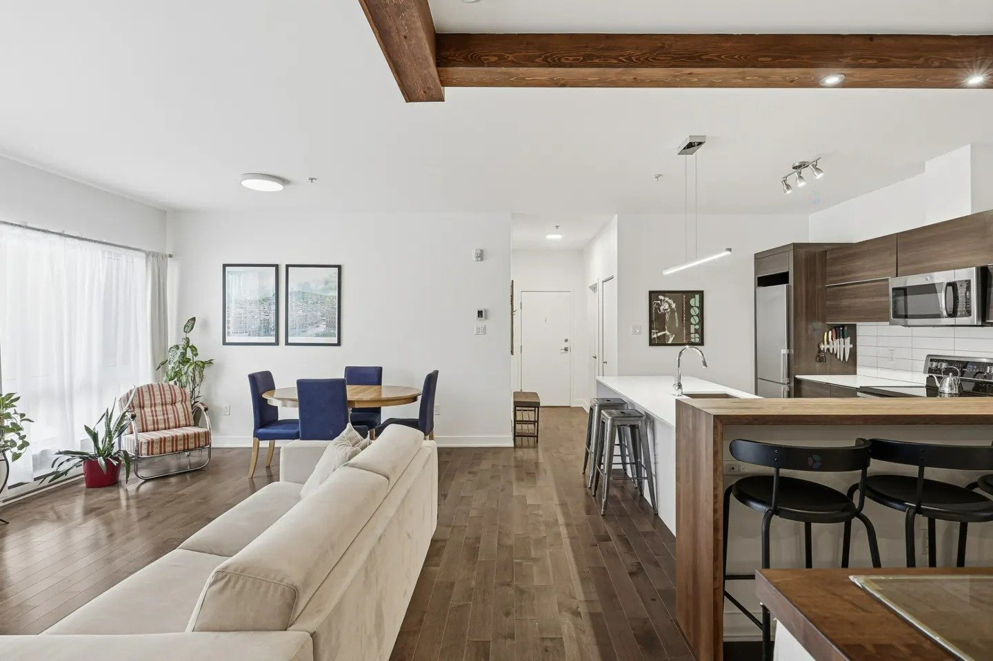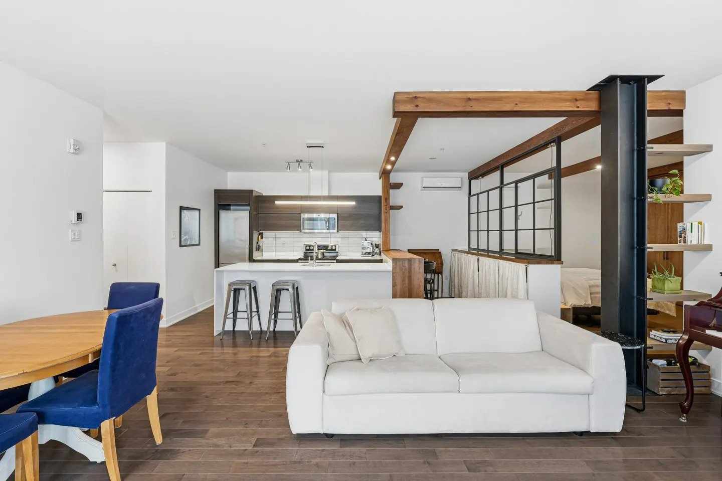 Die Wohnung wird vollständig möbliert vermietet. Die Einrichtung ist modern und neu. Im Wohn- und Schlafbereich befinden sich ein Doppelbett, ein großes Dressing mit viel Stauraum sowie eine bequeme Couch. Die offene Küche ist komplett ausgestattet. Der Boden besteht aus hochwertigem Naturholz‑Parkett. Die Wohnung wurde vollständig renoviert und befindet sich in einem sehr gepflegten Zustand.